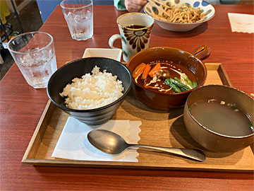 お昼時だったので、店内でランチ。ホリデーランチ「ハンバーグデミグラスシチュー」と沖縄そば。
