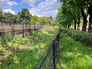 玉石張りの水路。戦時中に調布飛行場周辺から水が進入するのを防ぐため、また周壁を代用するために当時の東京市が36万円(現在の価値で約1億3千万円)かけて建設したものです(近くの看板、後略)。