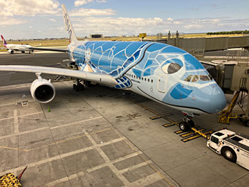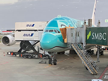 成田空港から出発。行きのホヌは緑のカイ君(JA382A)