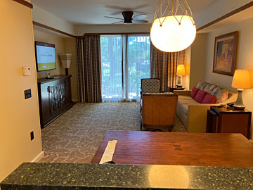 今回の部屋。1ベッドルームヴィラです(レイアウトはこちら)。キッチンからリビング方向。