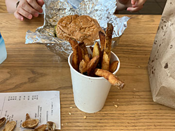 リトルを頼んだつもりでしたが、レシートを見ると普通サイズのハンバーガーでした。ちょっと焦げ気味のポテトもいっぱいもらいました。待っている間につまむコンセプトのピーナッツも1袋もらいました。