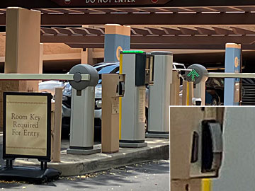 駐車場の出入口。ルームキーで開くのですが、最初に出る時に押し付ける場所を間違え、近くにいた係の人に教えてもらいました。(恐らく上半分のグレーのところではなく、下半分の黒いところが正解)