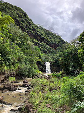 ワイメアの滝。茶色くにごった滝つぼでしたが、泳いでいる人たちがいました。