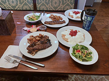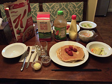 夕食。コアパンケーキハウスで買って来たカルビやパンケーキ、サラダ。