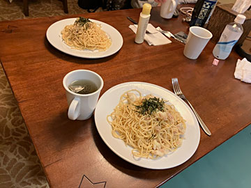お昼は部屋でスパゲッティ。グリルはIHヒーターですが、大きめのおなべがあり、お湯がぐるぐる循環しました