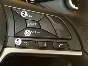 ①を押してオートクルーズ機能をONします(インパネに--マイル表示が出る)。走行中、いいなと思ったスピードで②(SET)を押すと、その時のスピードが保持されます(インパネにも設定スピードが「55マイル」みたいに表示される)。設定スピードは、③で+1、②で-1出来ます。ブレーキを踏むと、オートクルーズは一時的に解除されるので、復帰させる時は、③(RESUME)ボタンを押します。