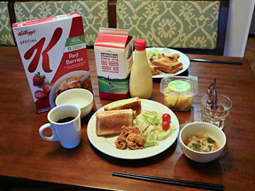 ディズニーバケーションクラブのコンセプトは自炊(旅の我が家)。日本からも持ち込める食材を持ち込み(肉類はNGで、お米とか調味料はOK。入国時に聞かれたので用意してきたリストを見せました)、近くのショッピングモールのスーパーでも食材を買って来ています。