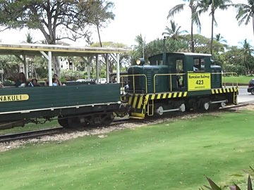 アウラニのあるコオリナリゾート地区には、コオリナゴルフクラブを横切り、鉄道が通っています。ハワイアンレイルウェイです。一度乗ってみたいと思っていました。このディーゼル機関車でけん引して、アウラニの先まで行って、バックして戻ってきます。
