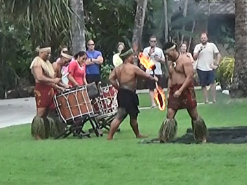 ポリネシアンカルチャーセンターは、エリア別に色々な国の踊りとかがあるのだろうな、と想像していて、実際、タヒチの踊りを見て、ハワイのフラダンスを見て、やっぱりこんな感じなのかな?と思いましたが、次のフィジー、トンガ、サモアは単なる踊りではなかったので楽しめました。フィジーでは、竹の筒を地面に叩きつけるリズムが3つあり、全員でリズムを合わせて声も出し、一体感がありました。トンガでは、ワシントン、フロリダ、LAの人を参加させて、踊りや太鼓を叩かせていました。見ている人たちの乗りも良かった。サモアでは、トークショー的なところは付いていけないところもあったけど、火を回すダンスとか、あっという間にヤシの実に登るとかすごかった。