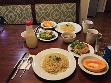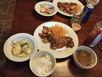 夕食。アイランド カントリー マーケットで買ったパパイヤ付き。