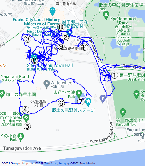 GoogleMapに言われるまま、稲城ICで降りて多摩川沿いを来ました。通りの反対側、野球場側の駐車場に入れましたが、そちらも2F建て駐車場、道路を挟んで反対側の郷土の森の駐車場も2F建てでした。駐車場も無料で、さすが府中市はお金持ち。