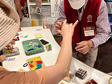 パズルのコーナー。ボランティアのおじさんがたくさん。中指~薬指にひもを通して、リングを下からそうっとひもに通して上げていき、中指と手のひらでリングを持って、ぱっと離すとリングがひもに引っかかる、というマジック(?)