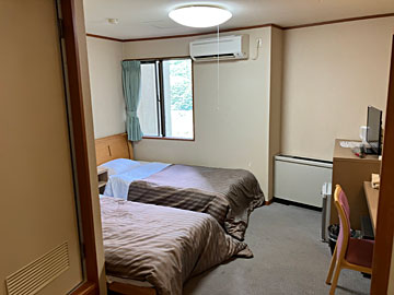 今回の部屋。このホテルで昨日(急に泊まることにした)一部屋だけ残っていた一番狭い部屋(洋室ツイン)です。左側にユニットバスのドアがありますが、一段高くなっています。