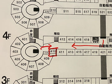 見取り図を見ると、2Fから5Fの同じ位置にこの狭い部屋があり(2Fは貸していません)3F~5Fは客室として使っていますが、昔は布団部屋のような、業務用の部屋だったのを、ユニットバスとか、エアコンとかを付けて(ヒーターは以前からあったと思われます)リフォームして貸すようにしたように思われます。部屋のドアもこの図の左側に付いていて、少し変でした。