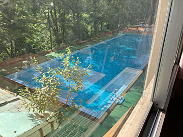このホテルには屋外に夏季限定で温水プールがあります(これは次の日に撮った写真なので誰もいません)。17時までだったので、ひと泳ぎしたあと、大浴場に行きました。30℃に温めているのだそうで、25mプールの向こうに子供用の丸いプールもあり、結構(10人くらい)泳いでいました。プールの中で顔を出していると頭に虫が寄ってきました。