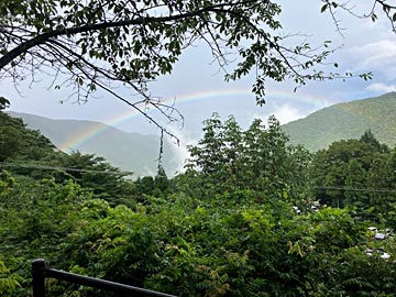 段々になっている外の露天風呂に入りました。若干小雨でしたが、半周つながった虹が見えました