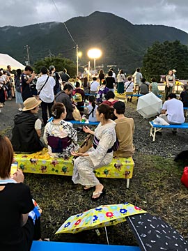 盆踊り会場横の、長椅子の後ろに陣取り、50分ほど待ちました。奥に見える山肌に、このあと大文字が浮き出ます。