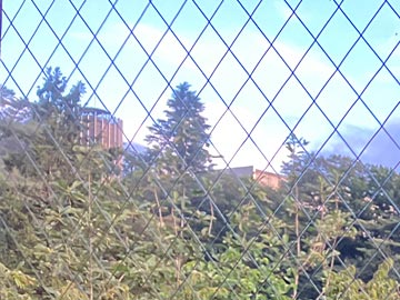 部屋から見た窓の外。左端に彫刻の森美術館の幸せをよぶシンフォニー彫刻(円筒形)が見えます。