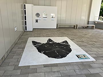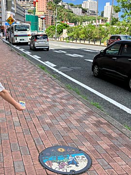 サンビーチ前の歩道で、「貫一お宮」のカラーマンホールを見つけました。