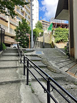 パールスターホテルの先(北側)から駅に戻ろうとすると、ものすごい階段の連続です。もっと手前(南側)の、ホテルかつらのところから坂道で登るつもりで曲がりそびれました。