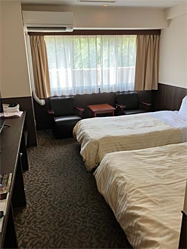 部屋は別館の4F。ダブルベッドとシングルベッドが入っていました。