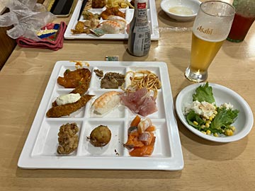 夕食はバイキング。我々は18:50~70分間。以前の伊東園は総入換え制だった気がしますが、今は時間をずらして段々と入れ替わります(もらう「食事中」カードの色が時間によって違う)。70分も食べる人はいないのでしょう。すごい行列になることもなく、スムーズになりました。