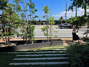 窓の外、道路の反対側にちょうど、貫一お宮の像があります。