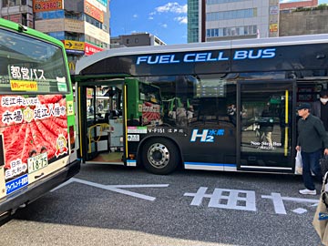 この日は、都営まるごときっぷ(都営地下鉄、都バス、都電荒川線一日乗車券¥700)で来ています。西大島駅から亀戸駅まで燃料電池の都バスに乗りました。女性の運転手さんで、モーターなので、静かに走りました。
