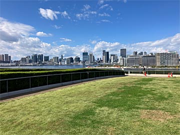 水産仲卸棟の屋上、緑化されています。この先のエレベーターを降りた、ぐるり公園でヒントを見つけました。答えは出ませんでしたが(帰宅してから正解が判明)、行先は富岡八幡宮と分かっていました。