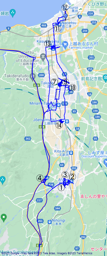 今回の演劇クエスト「はねうまのマレビト」は、①直江津駅、②春日山駅、③高田駅、④南高田駅、⑤上越妙高駅、⑥北新井駅、⑦新井駅、⑧二本木駅、⑨関山駅、⑩妙高高原駅、から始まる10話で、今回、①、②、③、⑤、⑦、のクエストを町歩きしたので、次回冬が開けたらまた来て残りをやろうと思います。