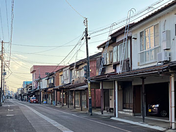 街並み。雪深いところなので、1Fの屋根が隣の家と「雁木」でつながっており、雪下ろしのために屋根に登るハシゴが常設されているようです。道路の中央には雪を解かす水が出る穴が並んでいます。