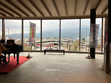 西口の展望デッキから(この日はかすんでいましたが)妙高連山が見えます。駅ピアノは最近グランドピアノになったらしく、この時は男性が弾かれていましたが、人が少なそうなので、駅ピアノを弾きたい人にはチャンスかもしれません。