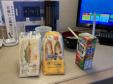 朝食は付いていないので、前日にホテルの道を隔てて反対側にあるローソンで買ってきています。右側は普通のカツサンドかと思いましたが、ネネチキン(韓国料理)でした。普通においしかった。