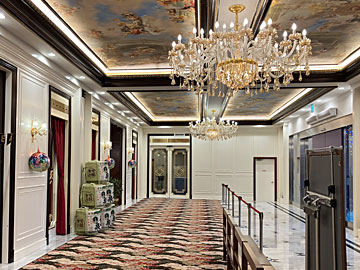 入り口に豪華なシャンデリアと天井画、酒樽も並んでいました。