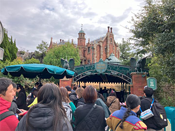 ホーンテッドマンション。スタンバイパスで乗りました。今回の謎解き「“死の呪い”を解くための手がかりを探せ!」に関連して、レイブン(カラス)の羽、の装飾がされていました。