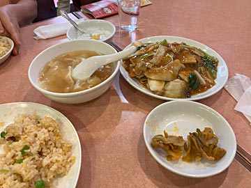 市場通りに入ったところの「龍門」で、五目焼きそばのセットと単品のチャーハン(左下)。(全部で¥2,255)。おいしくて量もちょうどよかった。