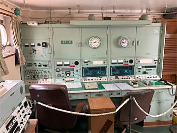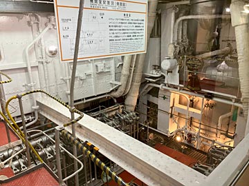 機関室。帆船ですが、600馬力のディーゼルエンジンを2基積んでいました。右にある円筒形のものはボイラーで、揚錨機、操舵機、浴室や調理室の温水、船内の暖房に使われるとのこと。