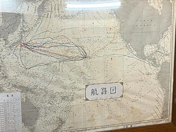 日本丸が航行したところを示す航跡図が貼ってありました。ハワイが主ですが、アメリカ西海岸や、パナマ運河を通ってニューヨークまで行ったこともあるようです。