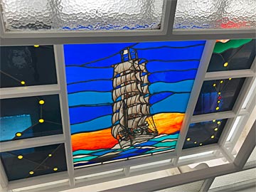 士官サロンの天井には、明り取りと換気のため、帆船のステンドグラスが貼られていました。