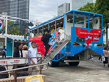 すぐ前の道路(歩道)で、スカイダックが乗船中でした。後輪の後ろにプロペラと舵が見えます。