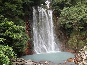 滝の奥に柱状節理が斜めになっており、水が斜めに流れ落ちていました。