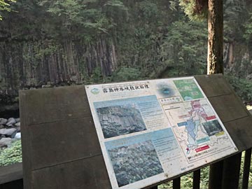 目の前にある崖は、御鉢火山の788年の噴火で流れてきた溶岩です。垂直方向の整然とした割れ目は、溶岩が冷え固まったときにできたものです(パネル説明の一部)。