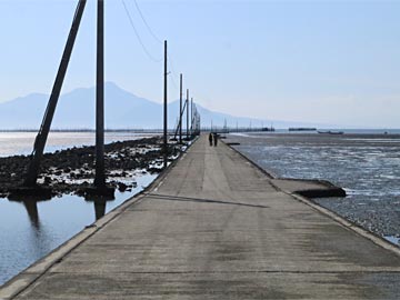 長部田海床路。満潮になるとこの道は海に沈むのだそう。