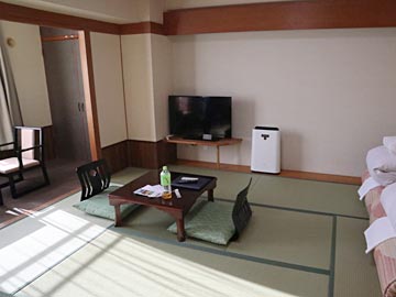 このホテル(大江戸温泉物語天草ホテル亀屋)は、楽天トラベルで予約した【訳あり部屋】。¥20,400。『浴室側蛇口より赤さびが出る恐れがあるため、バスルームのご利用はご遠慮ください。空調は旧式の吊り下げ式のためモーター音に敏感な方は選択をご遠慮ください』と書かれているノークレーム・ノーリターン(?)のような部屋(^^;。実際、大浴場に行ったので部屋の浴室は使いませんでしたし(赤水は出なかったが、湯量・湯温が少ない!?)空調も特に気になりませんでした。今どき部屋にWi-Fiが来ていなかったのはちょっと痛かったですが…(ポケットWi-Fiを持って来ている)。それに、大江戸温泉物語は、到着が17時を過ぎるようなら電話してね、とあるのですが(今回はギリギリ間に合った)、大江戸温泉物語共通で予約とかを受ける050番号で、ホテルに直接つながらないのもイマイチでした。