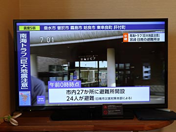 昨日、ちょうどチェックインしている時に地震(皆さんのスマホが「キュイキュイ地震です」と鳴って、少しして横揺れ)があり、テレビが「南海トラフ巨大地震注意」になっていました。