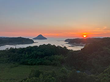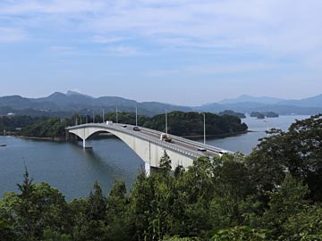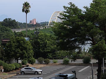 庭からちょっと山道を上がると、天草の橋が見えます。こちらは渡ってきた大矢野橋(2号橋)で、その奥に昨日泊まった「天草ホテル亀屋」が見えます。