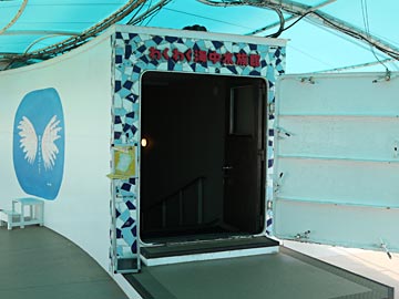 ドーナツ型の水族館、水面下に降りて行きます。海に浮かべた船が水族館となっており、ドーナツ型の水族館内をめぐると、世界の海を1周できるような展示となっているのだそう(リンク)。