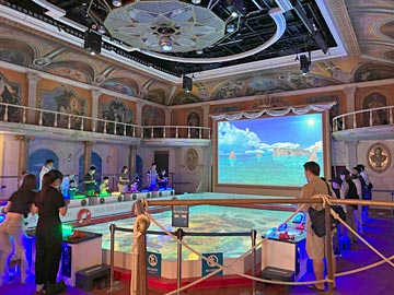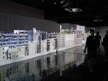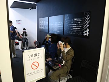 軍艦島の立入禁止の場所をドローンで撮影した画像をVRで見せてくれるコーナー。ドローンの動きは決まっていて、好きな場所に行けるわけではありませんが、首を上下左右に振ると、見たいところに視線を向けることが出来ます。