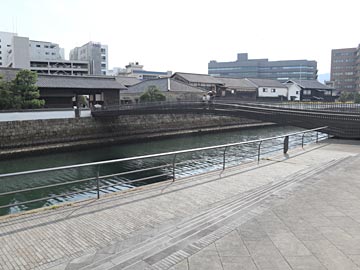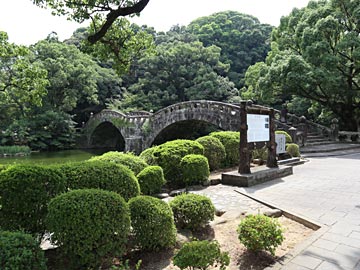 近くにある眼鏡橋を見に行ってみました。1839年にここから約500m離れた本名川にかけられた石積みの橋で、川幅拡張工事に伴い移設されたもの。国の重要文化財に指定されています(リンク)。