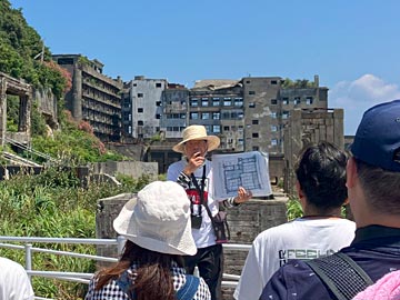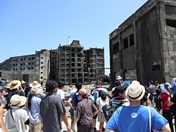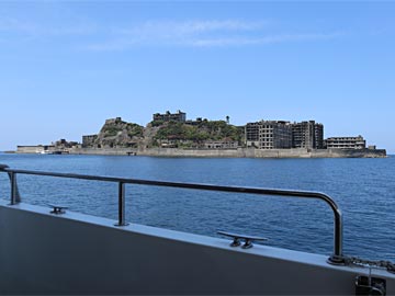 軍艦島:軍艦「土佐」に似ているということで、軍艦島と呼ばれていますが、石炭を採掘した炭鉱の島(端島-はしま-)です。